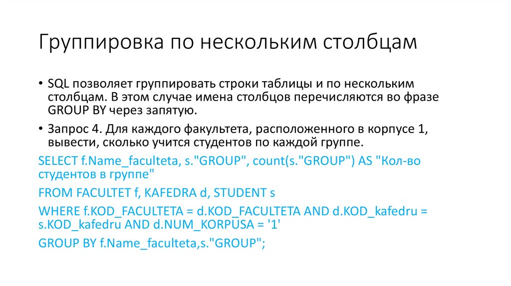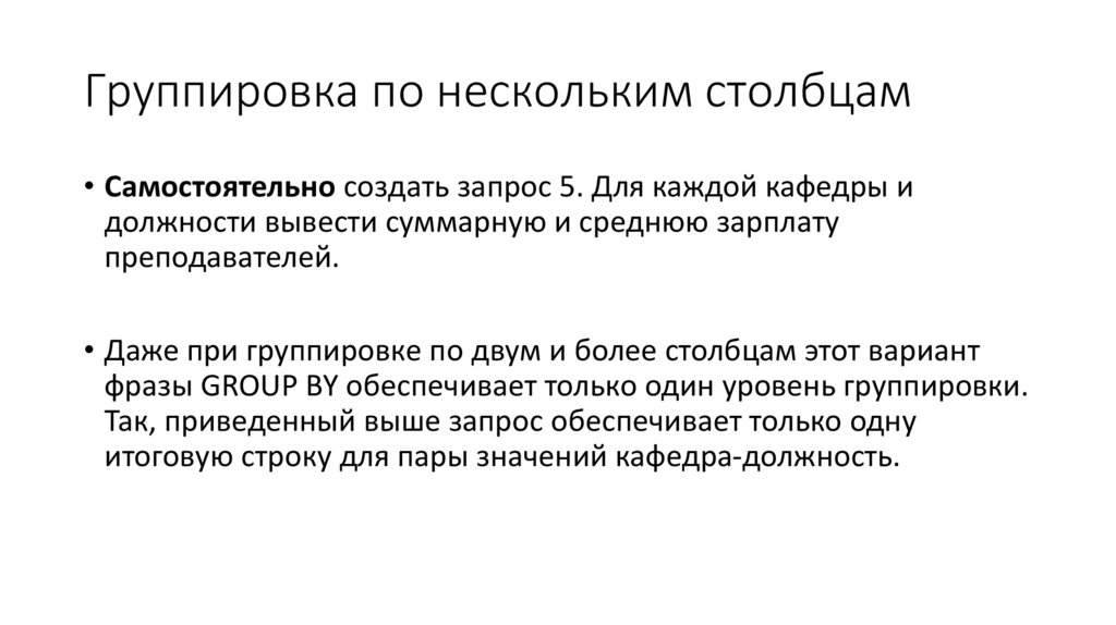 Группировка по нескольким столбцам• Самостоятельно создать запрос 5. Для каждой кафедры и