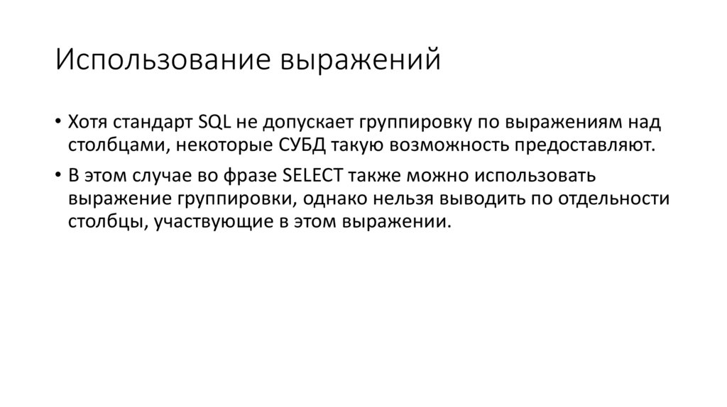 Использование выражений• Хотя стандарт SQL не допускает группировку по выражениям над