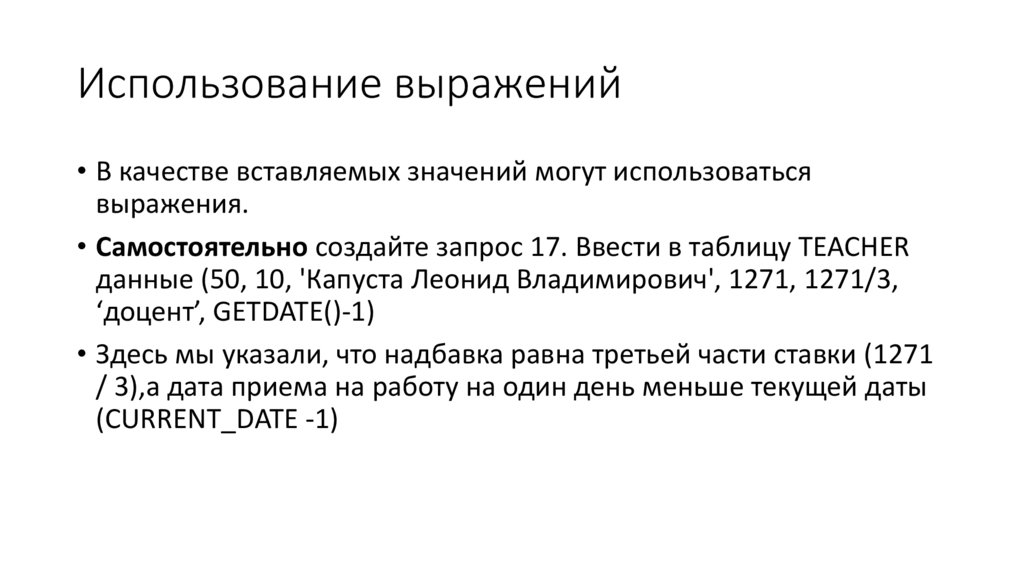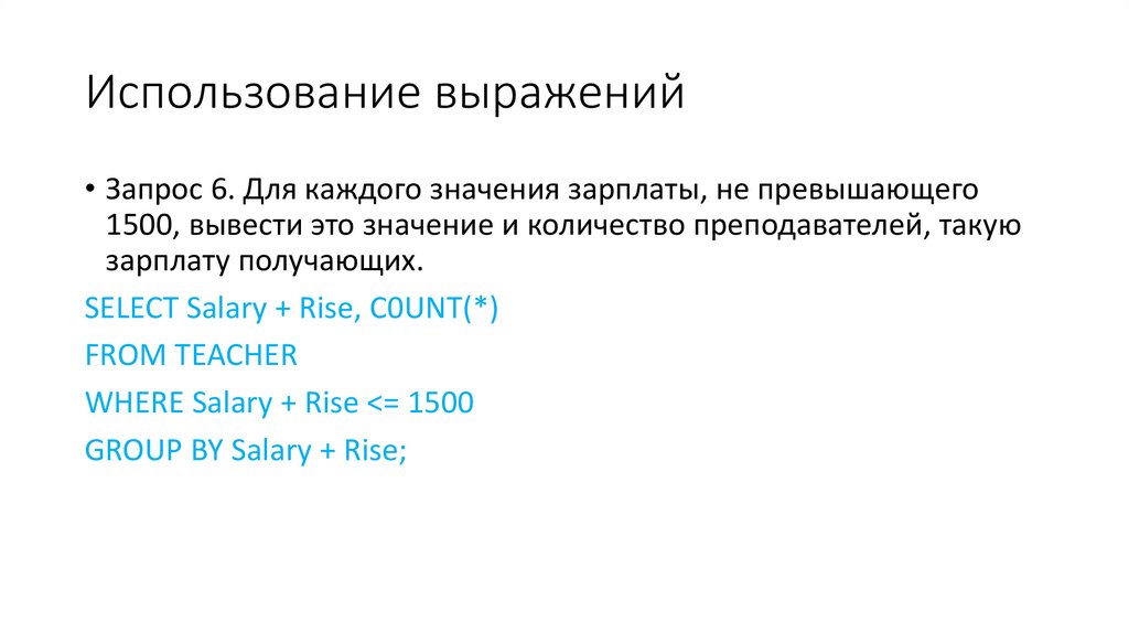 Использование выражений• Запрос 6. Для каждого значения зарплаты, не превышающего