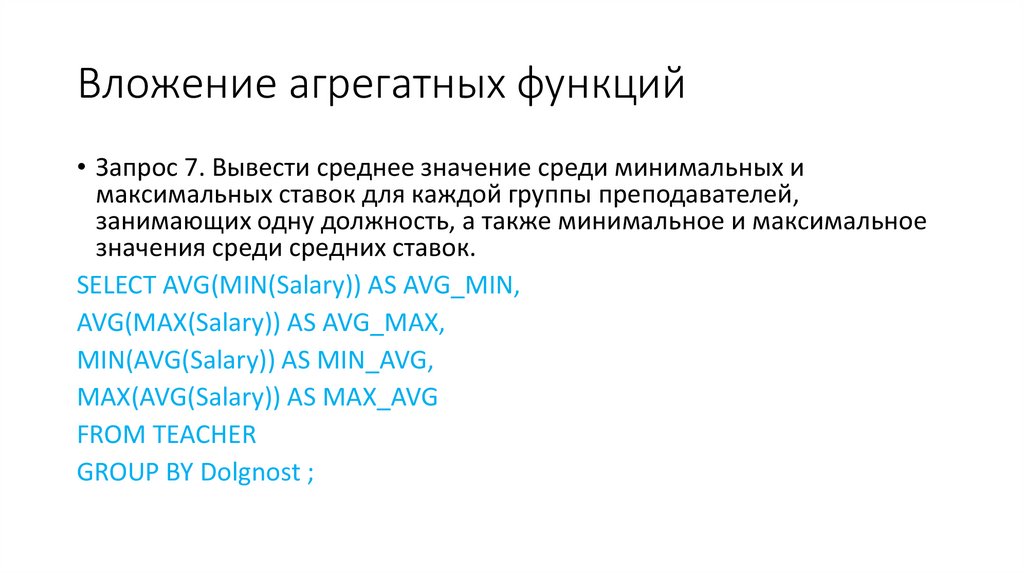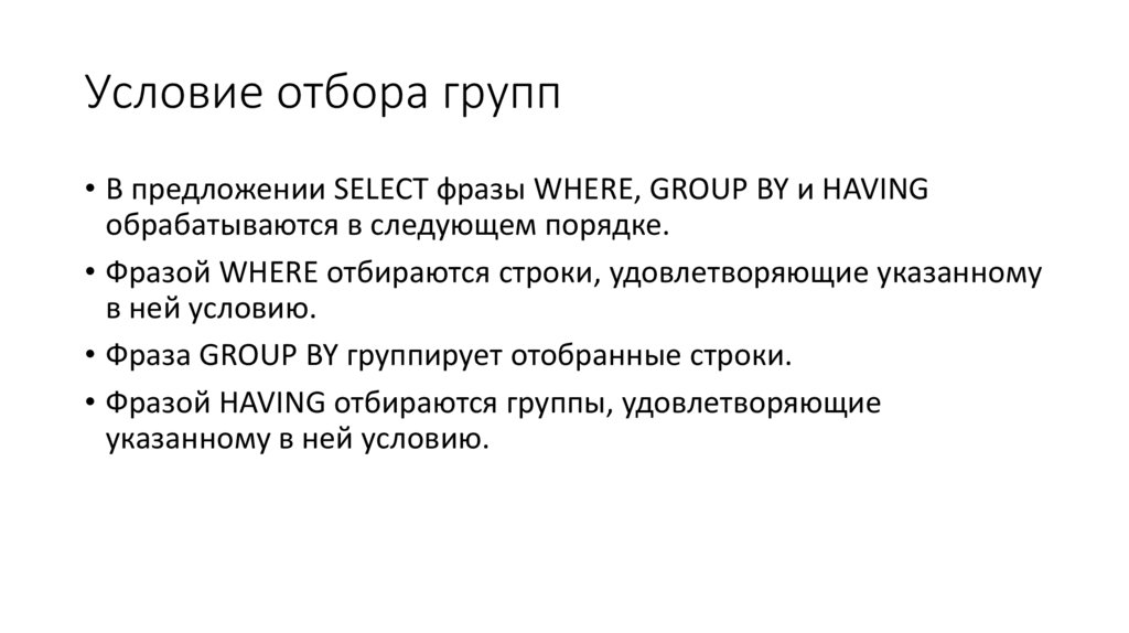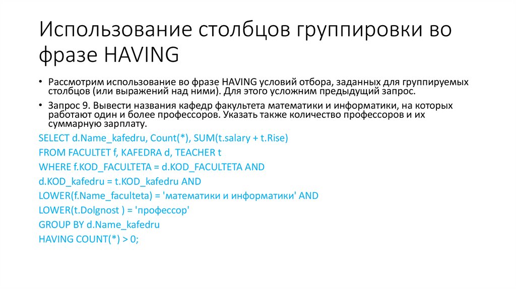 • HAVING, GROUP BY и ORDER BY.