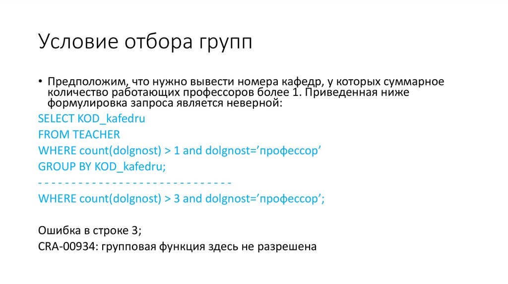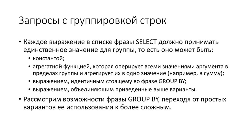 Запросы с группировкой строк• Каждое выражение в списке фразы SELECT должно принимать