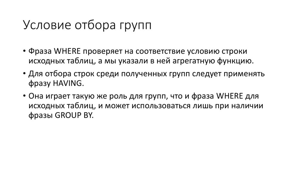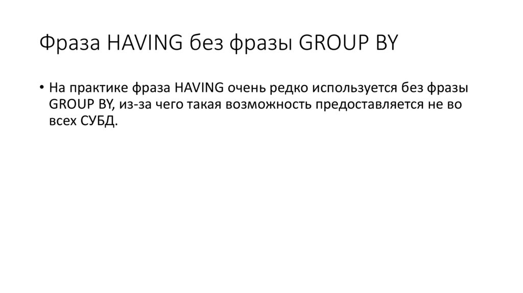 • Используется вместе с фразой GROUP BY и позволяет