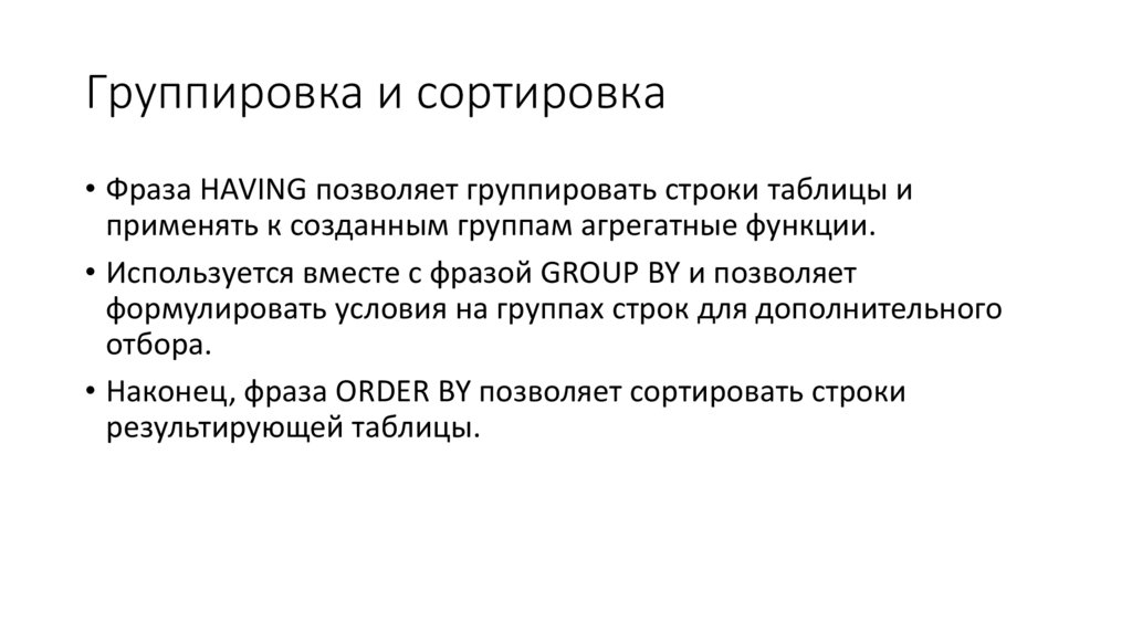 Группировка и сортировка• Фраза HAVING позволяет группировать строки таблицы и