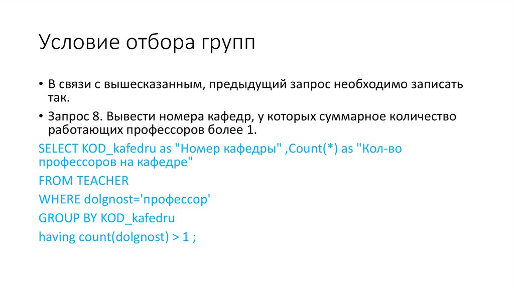 - 2 запроса с использованием условия отбора групп HAVING;