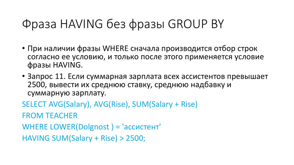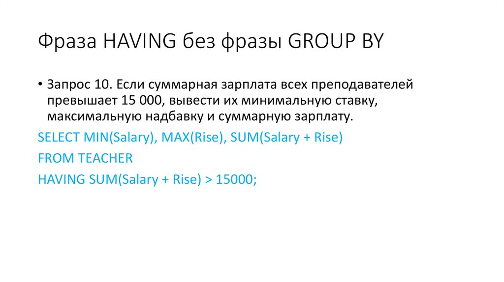- 2 запроса с использованием фразы HAVING без фразы GROUP BY;