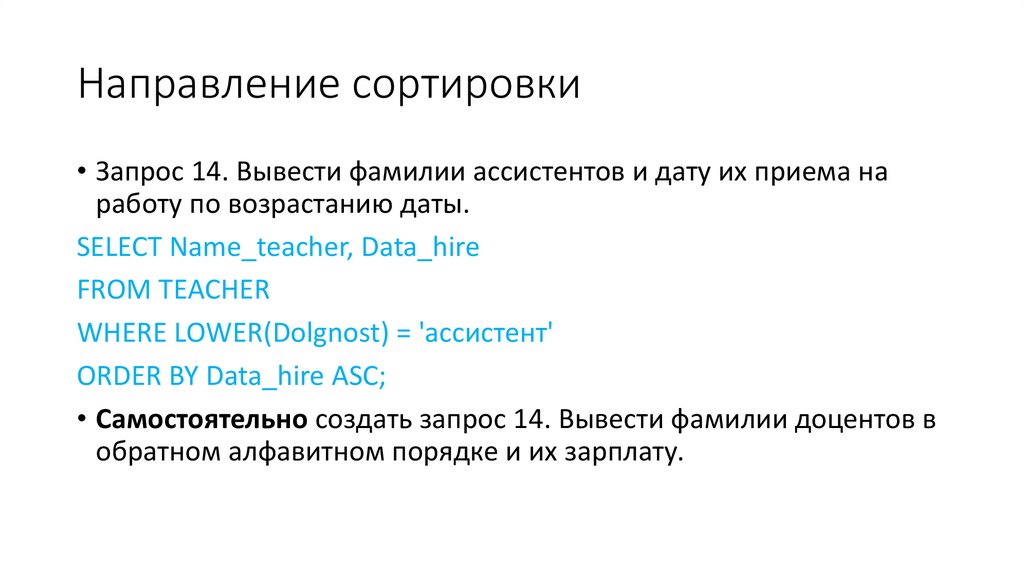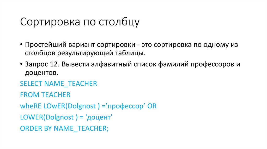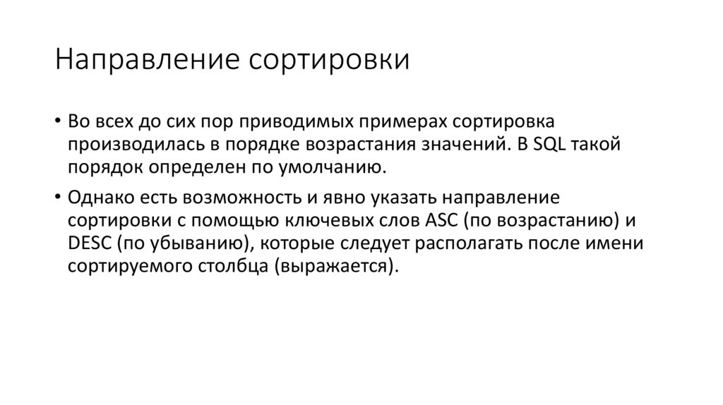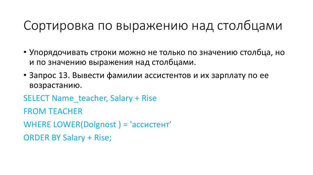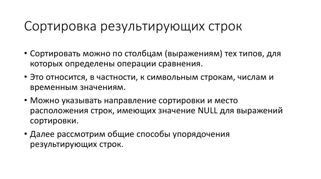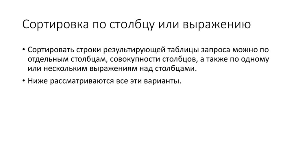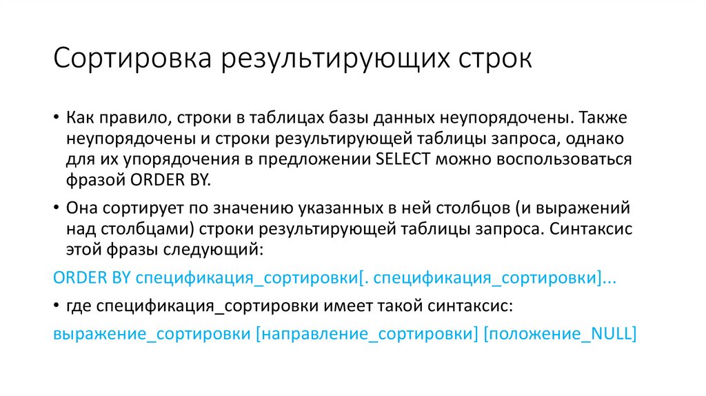 • Наконец, фраза ORDER BY позволяет сортировать строки