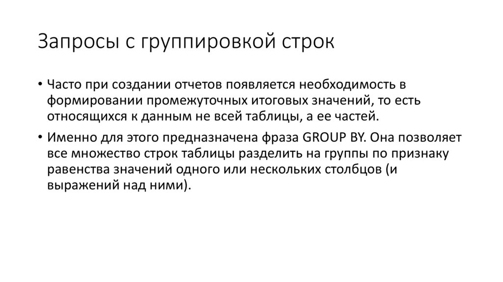 Запросы с группировкой строк• Часто при создании отчетов появляется необходимость в