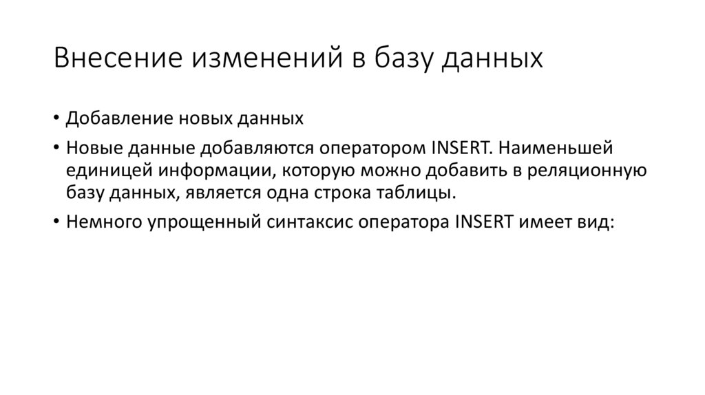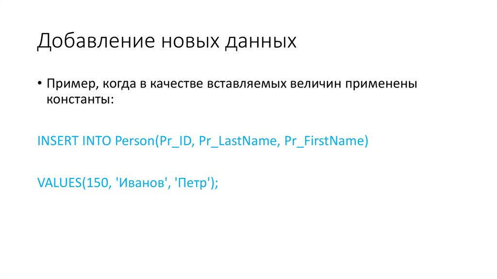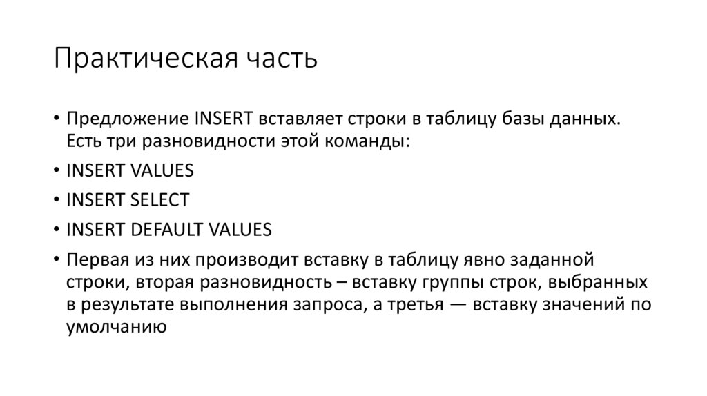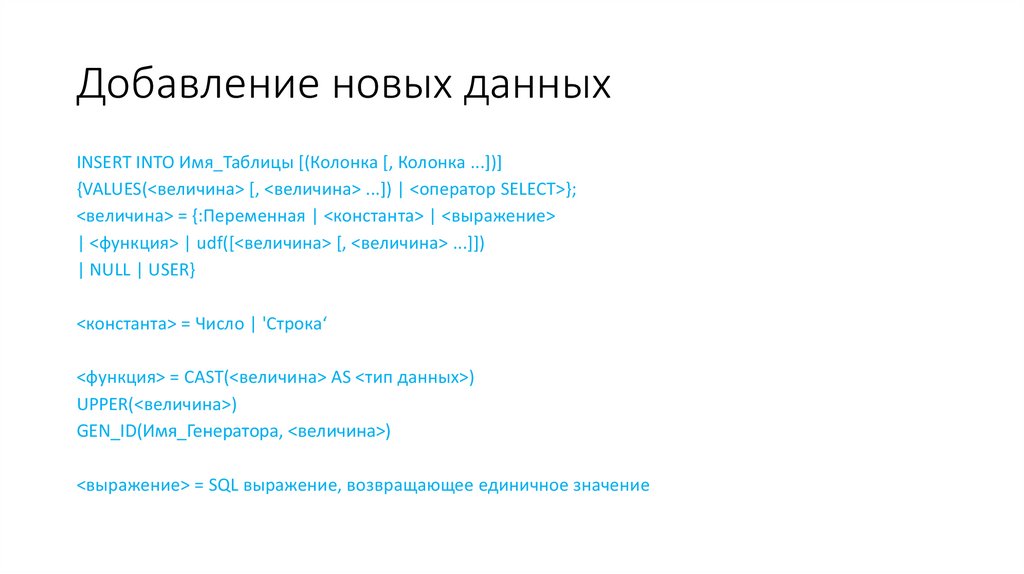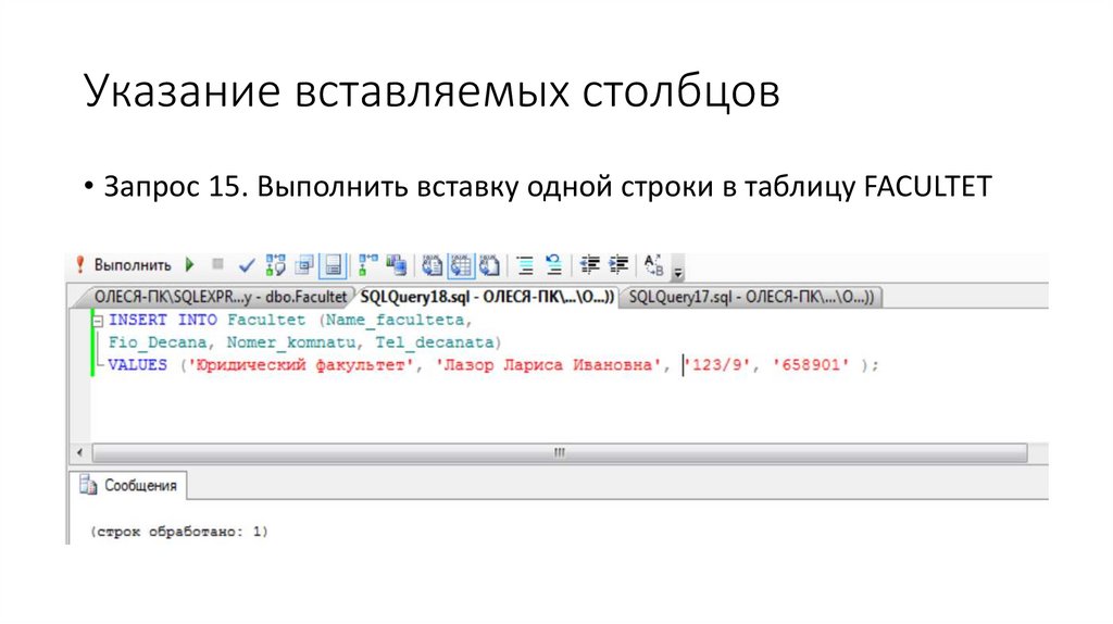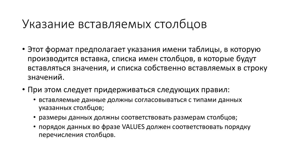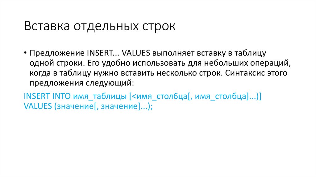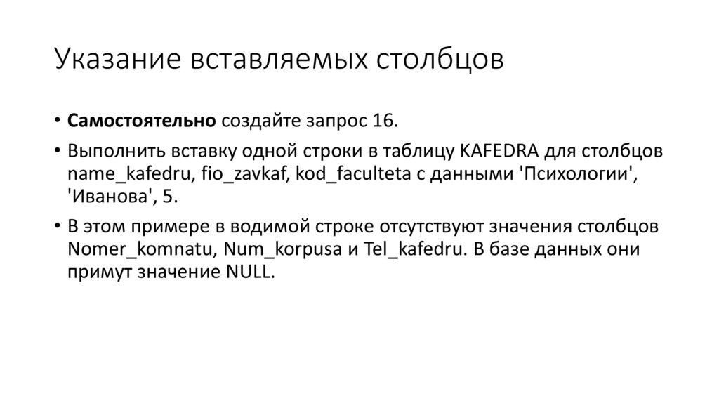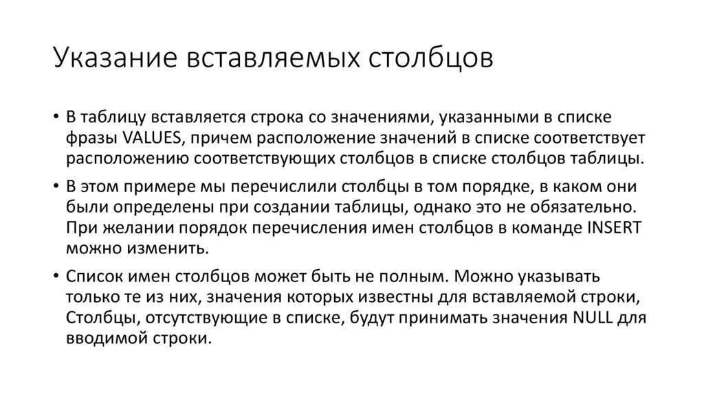 индивидуальные значения столбцов. Синтаксис команды