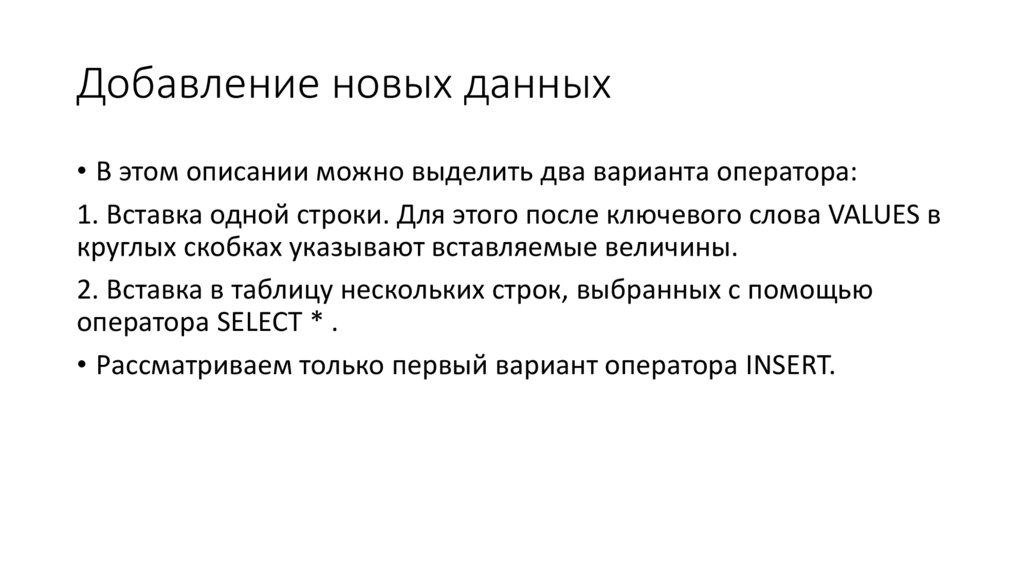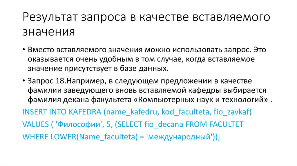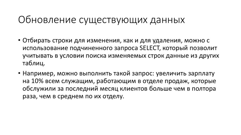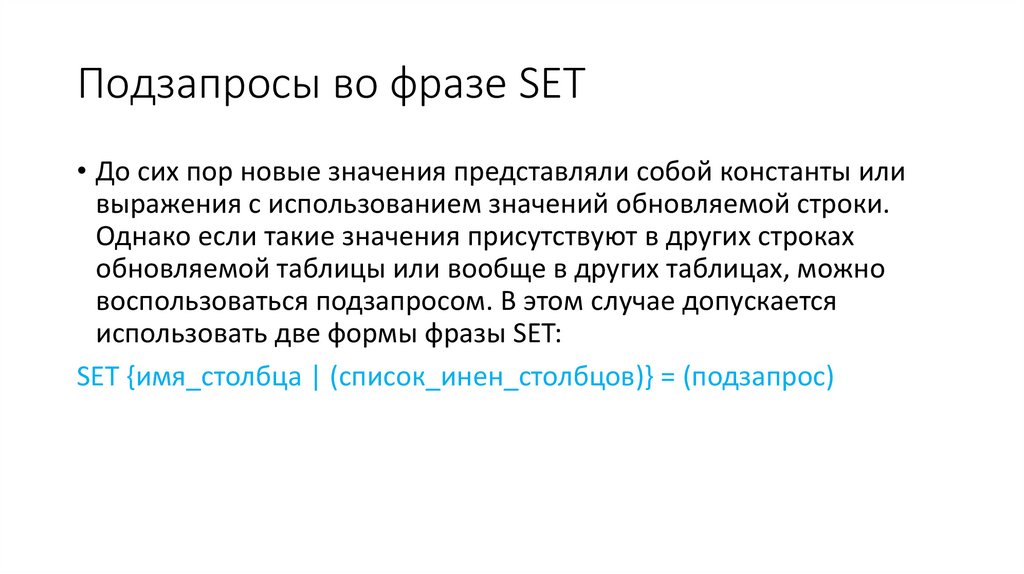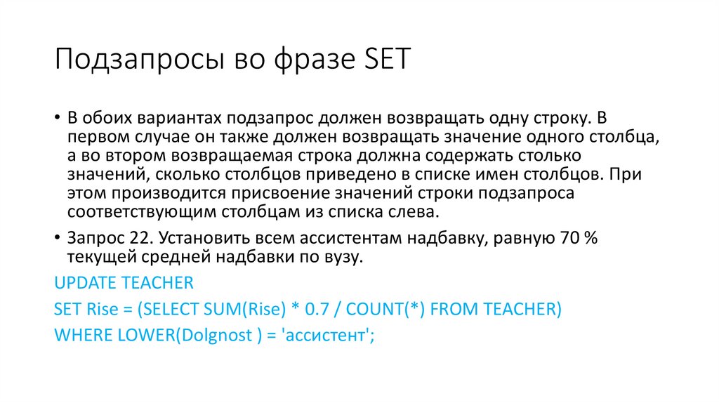 Подзапросы во фразе SET• В обоих вариантах подзапрос должен возвращать одну строку. В