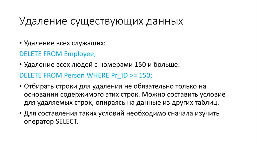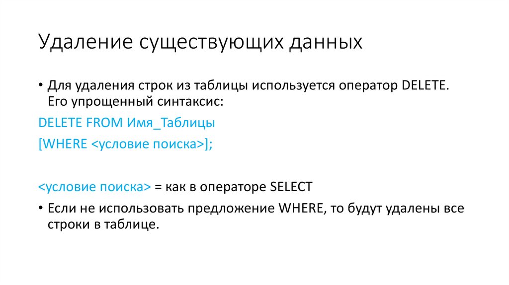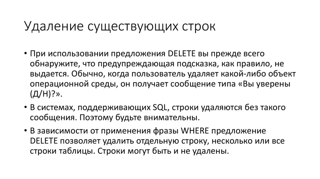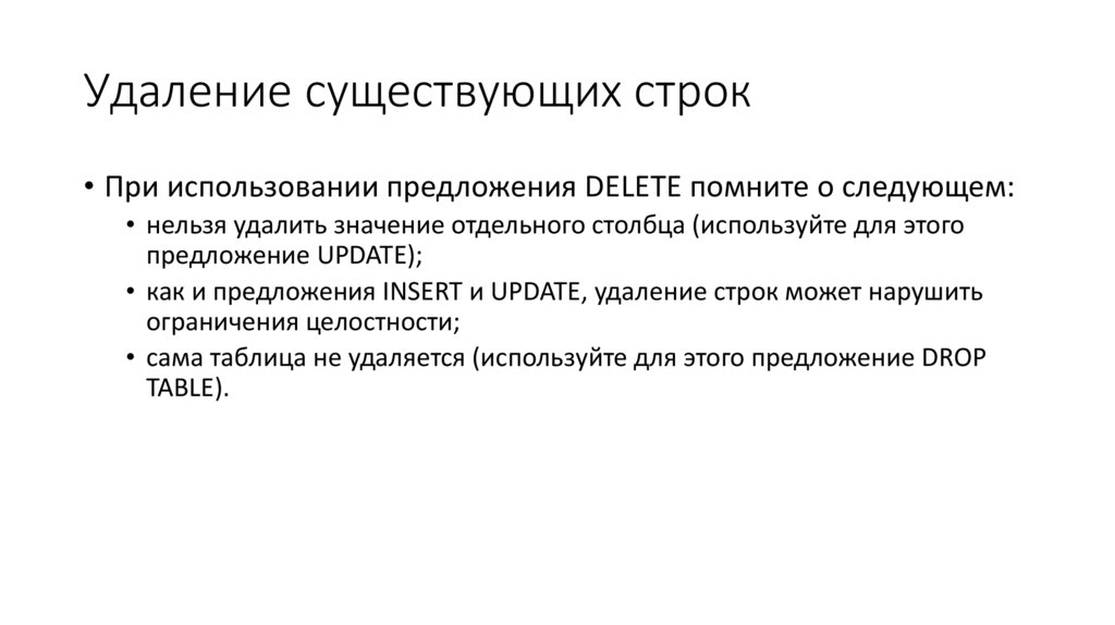 Удаление существующих строк• При использовании предложения DELETE вы прежде всего