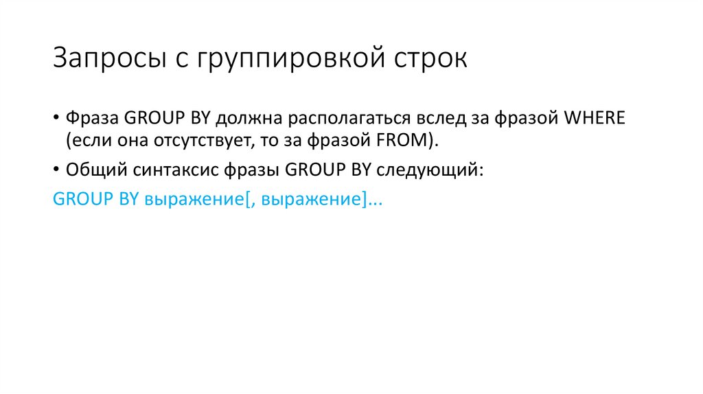 Запросы с группировкой строк• Фраза GROUP BY должна располагаться вслед за фразой WHERE