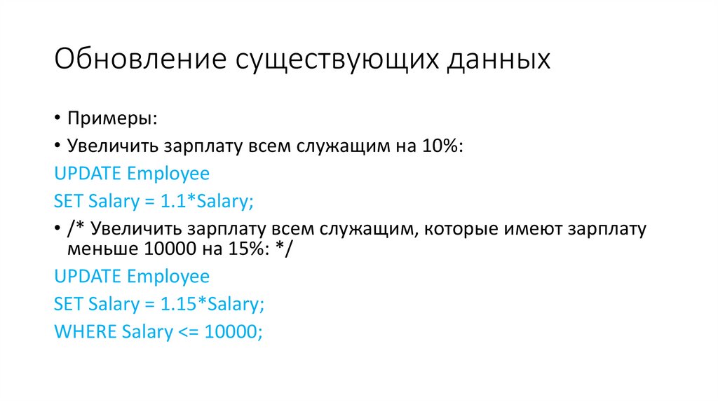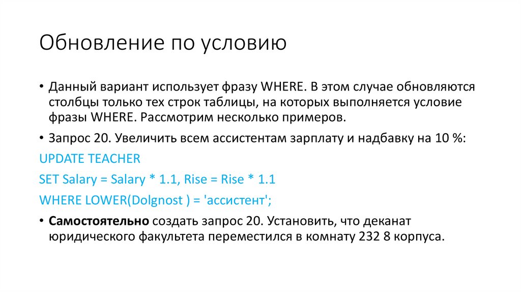 Обновление по условию• Данный вариант использует фразу WHERE. В этом случае обновляются