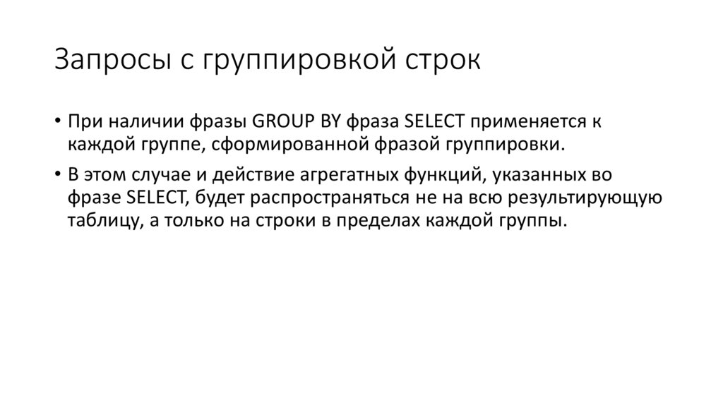 Запросы с группировкой строк• При наличии фразы GROUP BY фраза SELECT применяется к