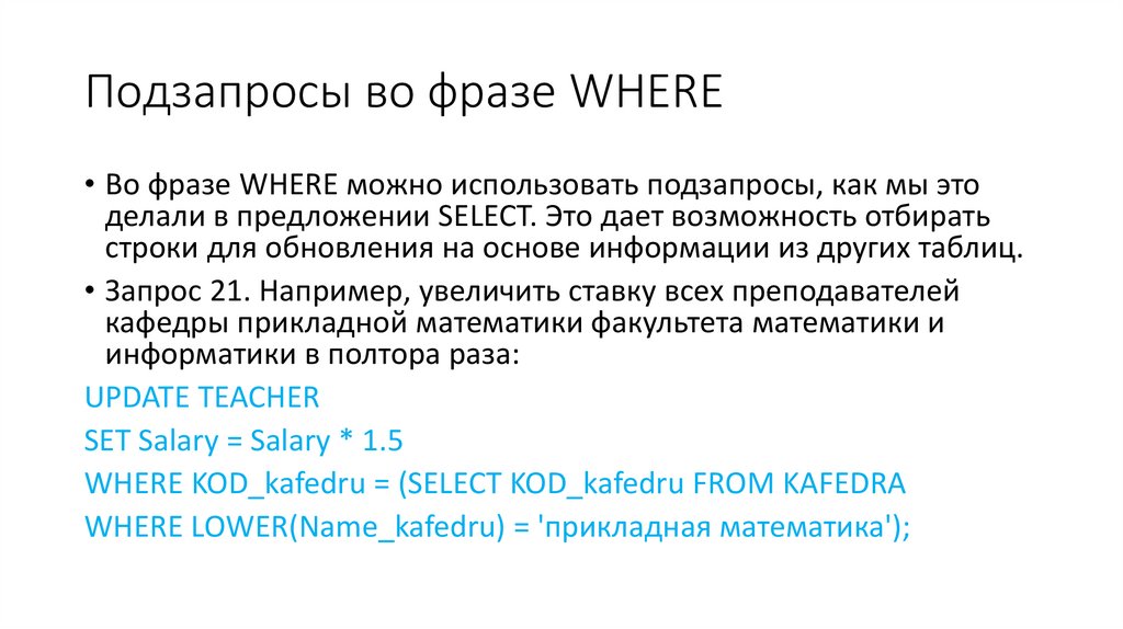 Подзапросы во фразе WHERE• Во фразе WHERE можно использовать подзапросы, как мы это