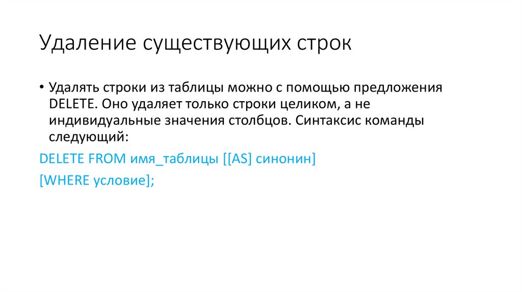 Удаление существующих строк• При использовании предложения DELETE помните о следующем: