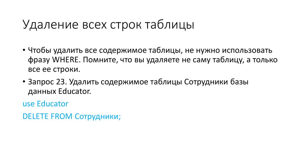 Удаление всех строк таблицы• Чтобы удалить все содержимое таблицы, не нужно использовать