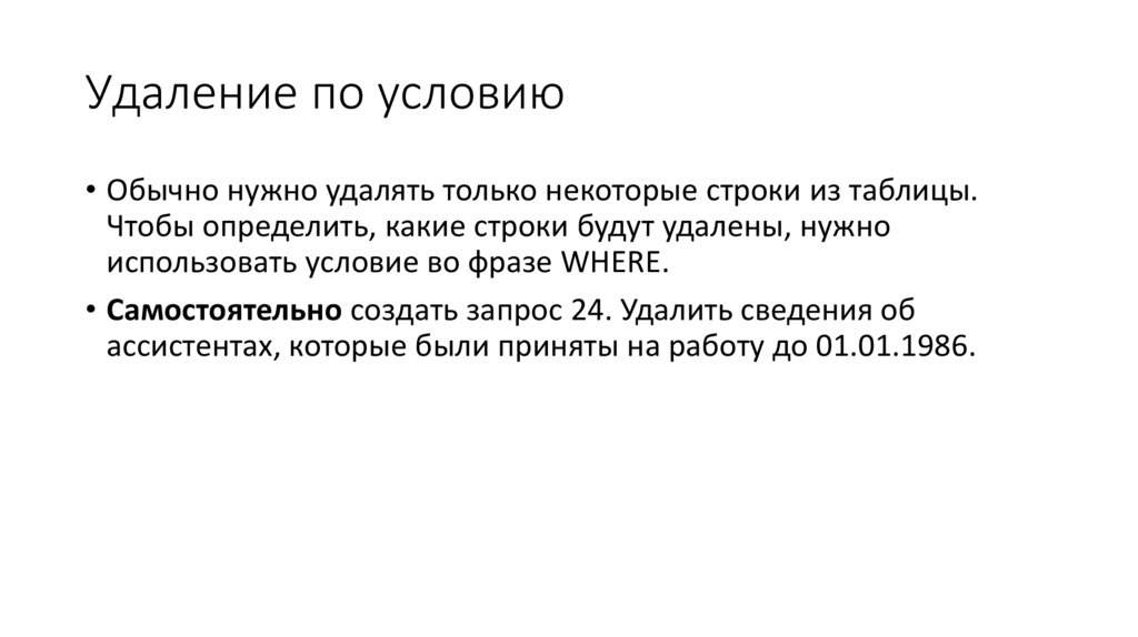 Удаление по условию• Обычно нужно удалять только некоторые строки из таблицы.