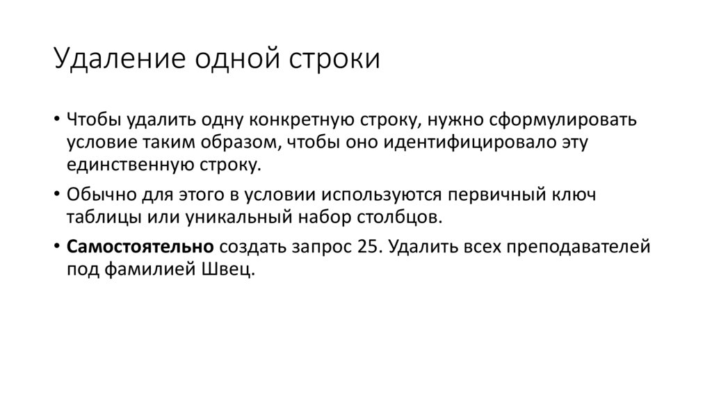 Удаление одной строки• Чтобы удалить одну конкретную строку, нужно сформулировать
