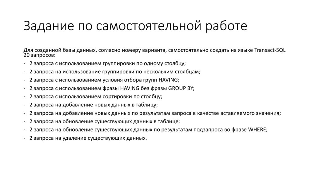 Задание по самостоятельной работеДля созданной базы данных, согласно номеру варианта, самостоятельно создать на языке Transact-SQL