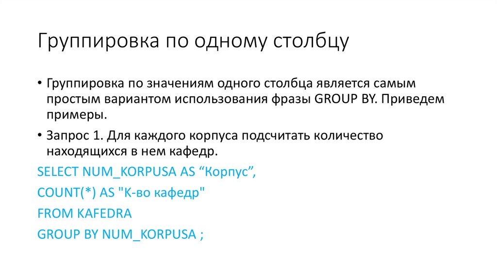 Группировка по одному столбцу• Группировка по значениям одного столбца является самым