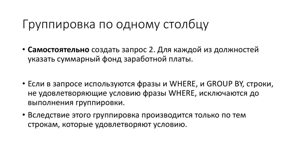 Группировка по одному столбцу• Самостоятельно создать запрос 2. Для каждой из должностей