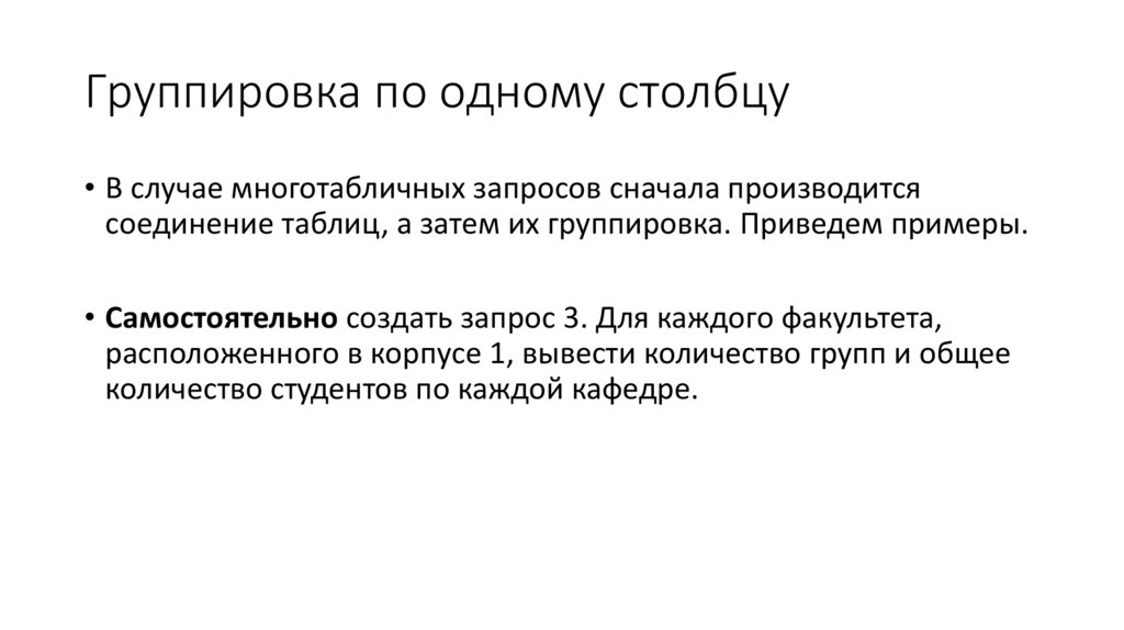 Группировка по одному столбцу• В случае многотабличных запросов сначала производится