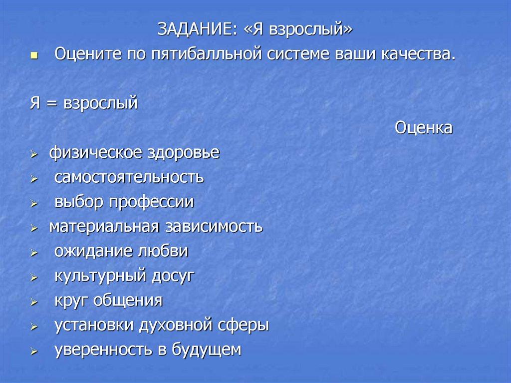ЗАДАНИЕ: «Я взрослый»Оцените по пятибалльной системе ваши качества.