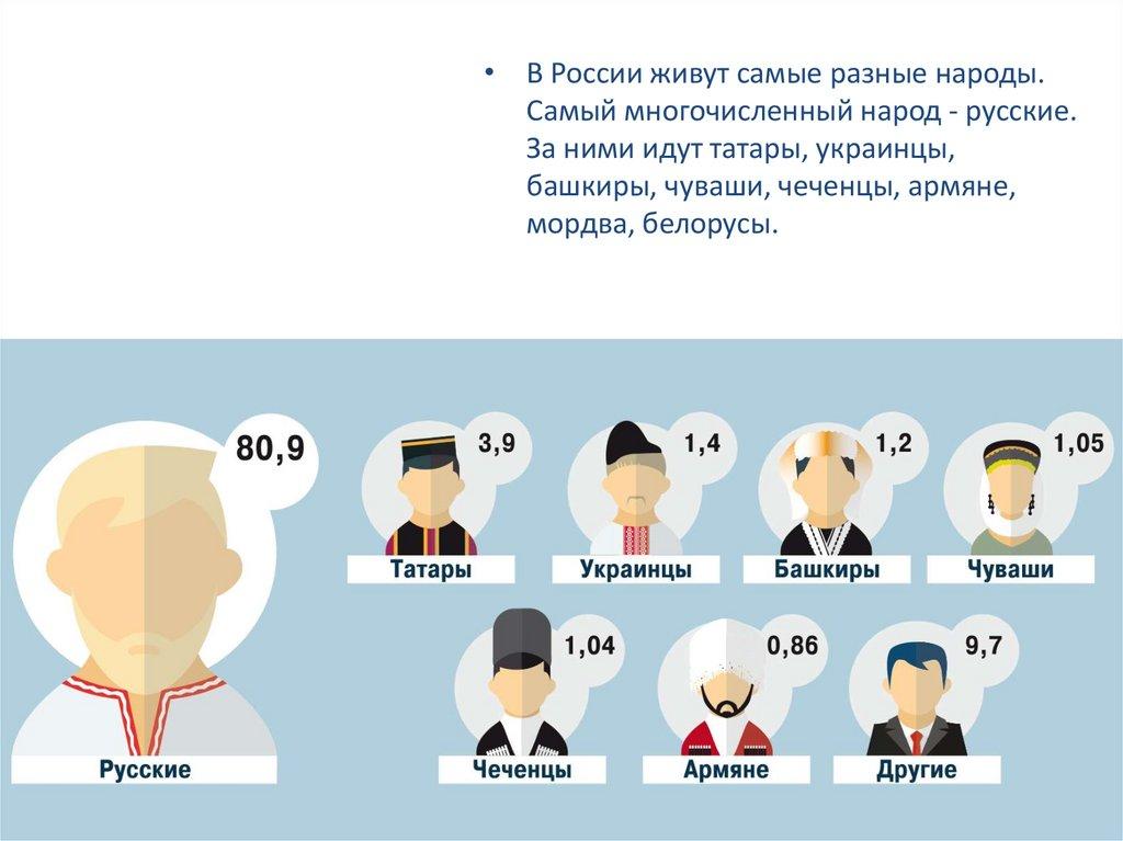 • В России живут самые разные народы.Самый многочисленный народ - русские.