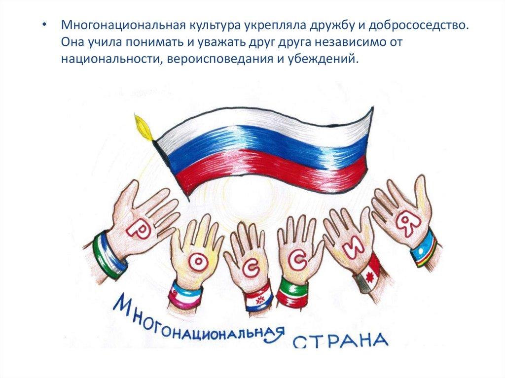 • Многонациональная культура укрепляла дружбу и добрососедство.Она учила понимать и уважать друг друга независимо от