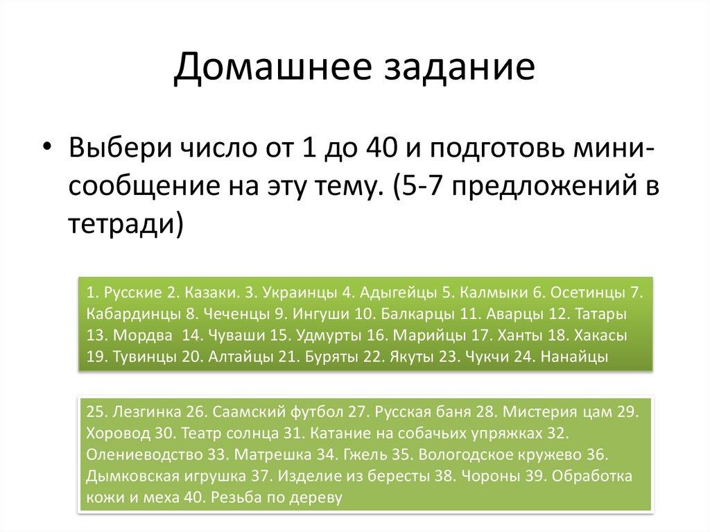 Домашнее задание• Выбери число от 1 до 40 и подготовь минисообщение на эту тему. (5-7 предложений в