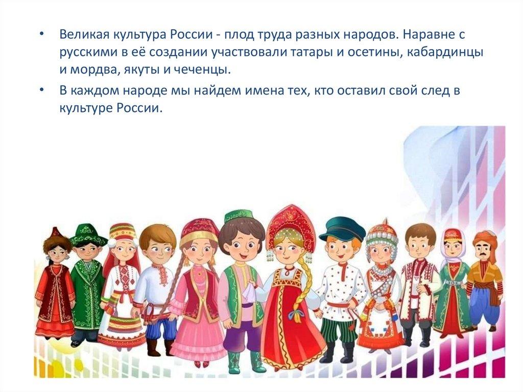 • Великая культура России - плод труда разных народов. Наравне срусскими в её создании участвовали татары и осетины, кабардинцы