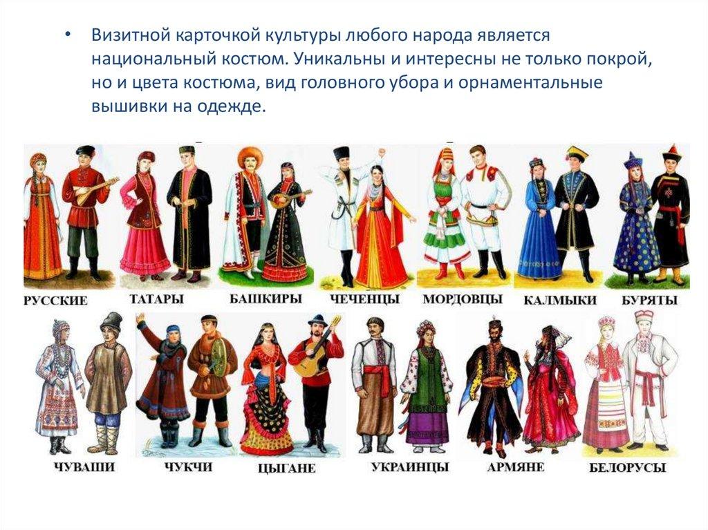 • Визитной карточкой культуры любого народа являетсянациональный костюм. Уникальны и интересны не только покрой,