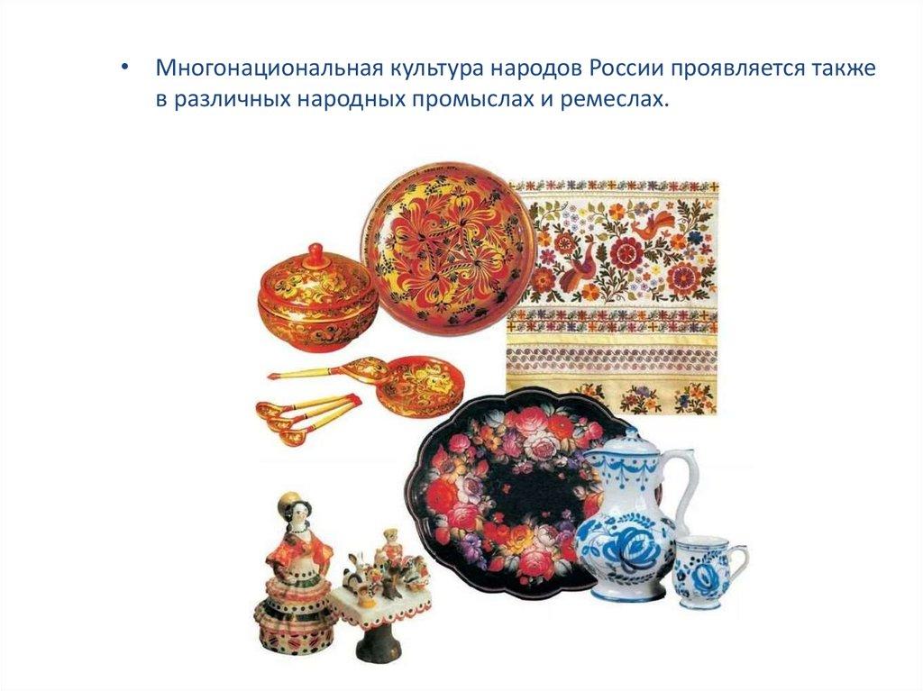 • Многонациональная культура народов России проявляется такжев различных народных промыслах и ремеслах.