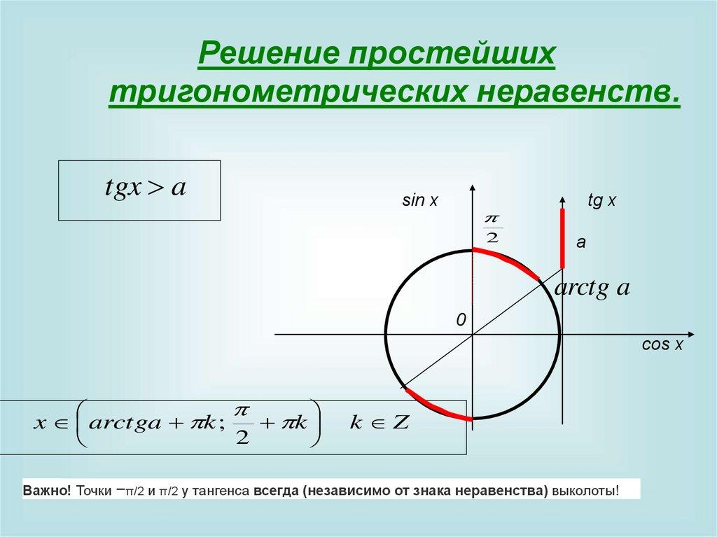 Важно! Точки −π/2 и π/2 у тангенса всегда (независимо от знака неравенства) выколоты!