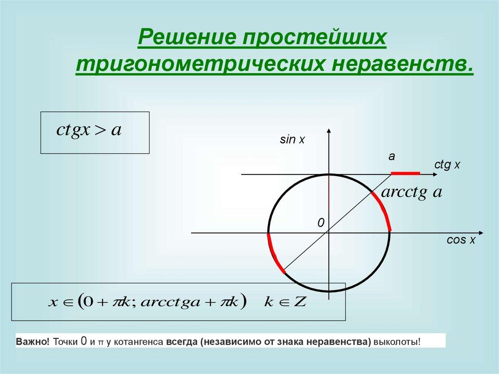 Важно! Точки 0 и π у котангенса всегда (независимо от знака неравенства) выколоты!