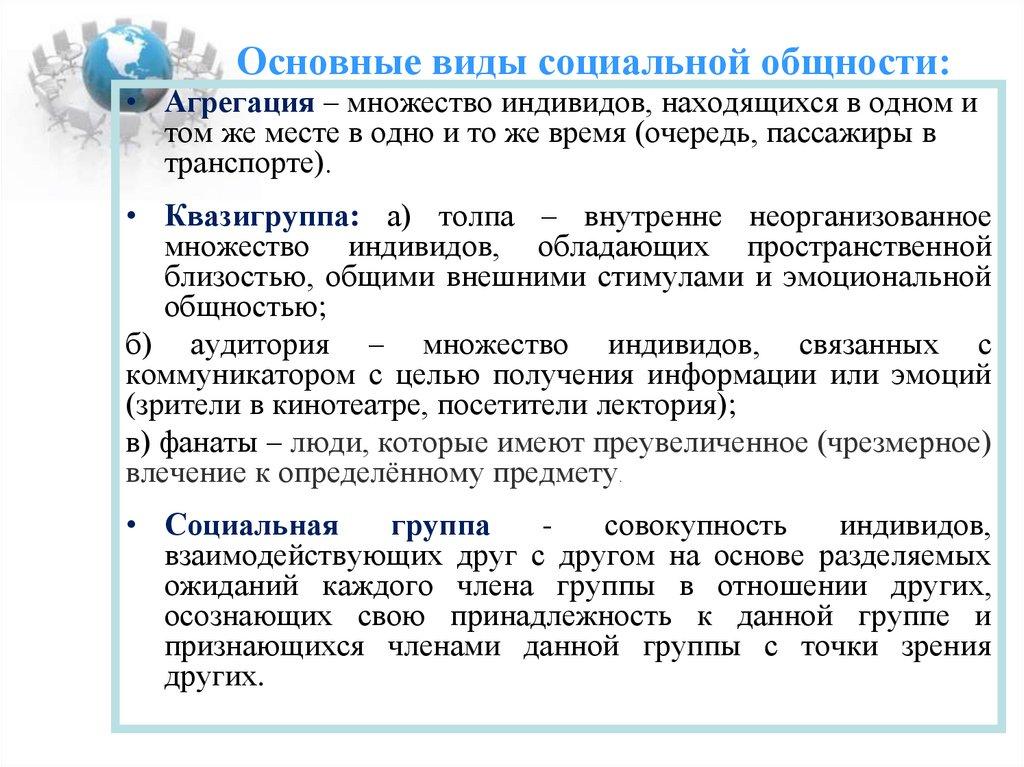 Основные виды социальной общности:• Агрегация – множество индивидов, находящихся в одном и