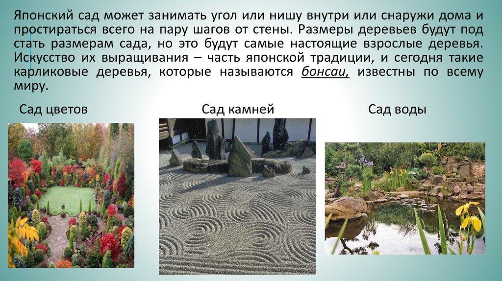 Японский сад может занимать угол или нишу внутри или снаружи дома ипростираться всего на пару шагов от стены. Размеры деревьев будут под