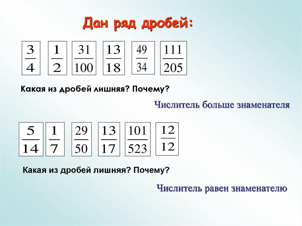 7. -Распределите дроби на группы. -Сколько групп получилось? -По какому принципу выполнено распределение?