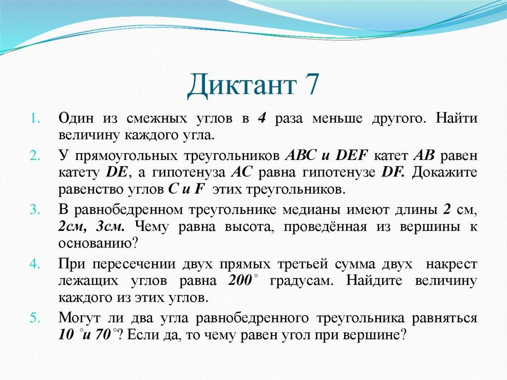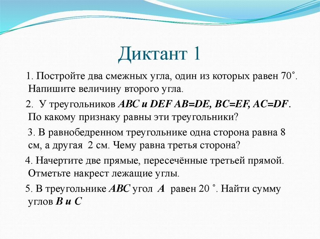 Диктант 11. Постройте два смежных угла, один из которых равен 70˚.