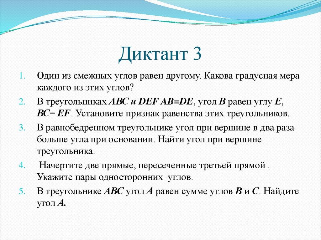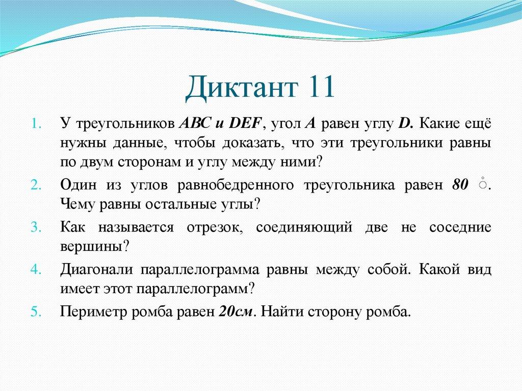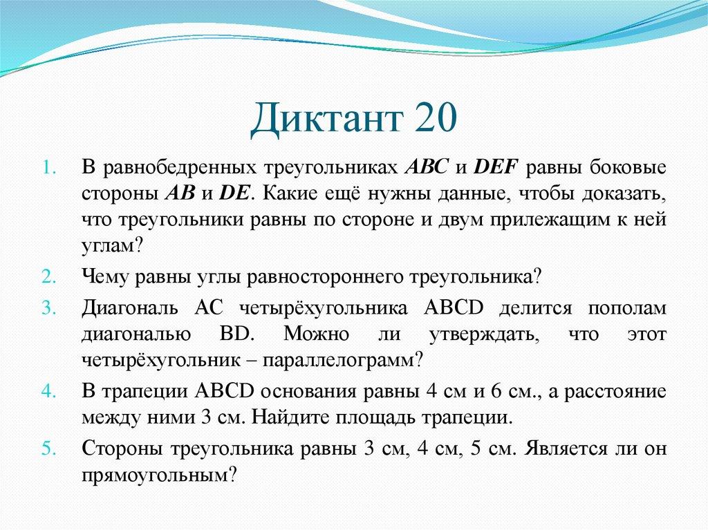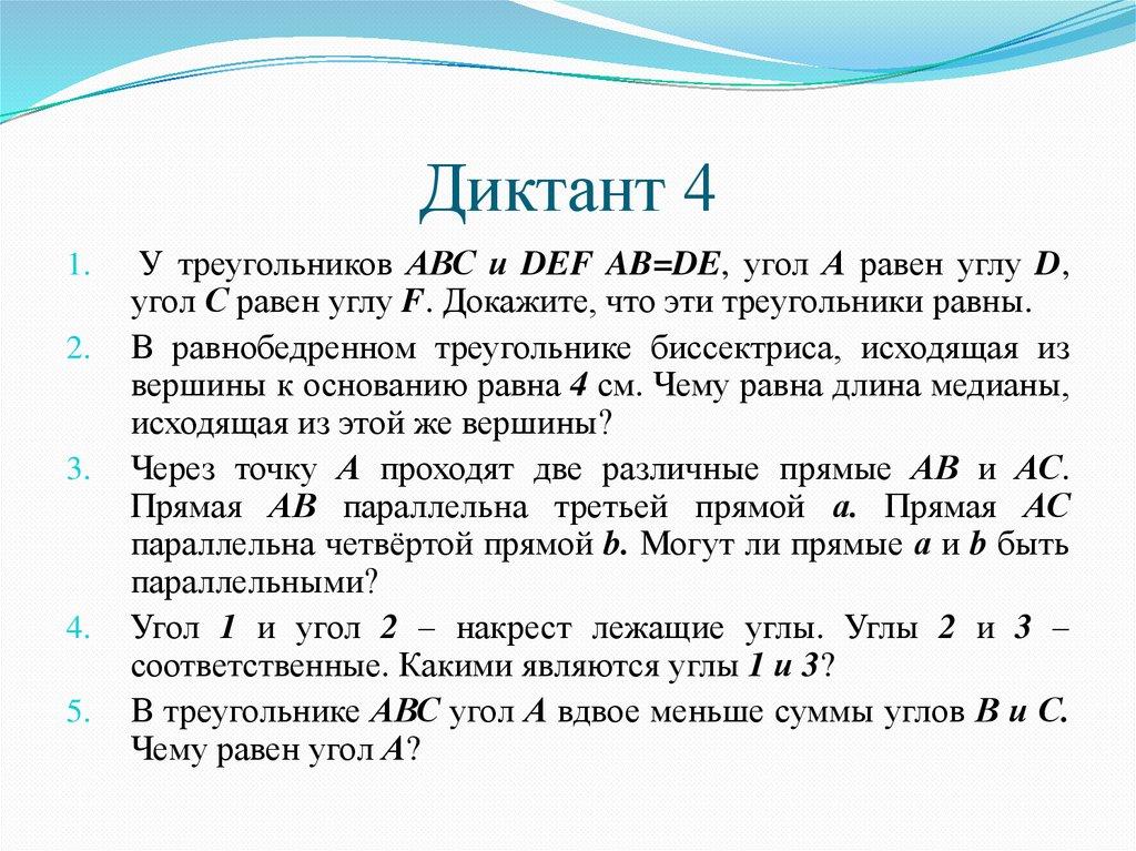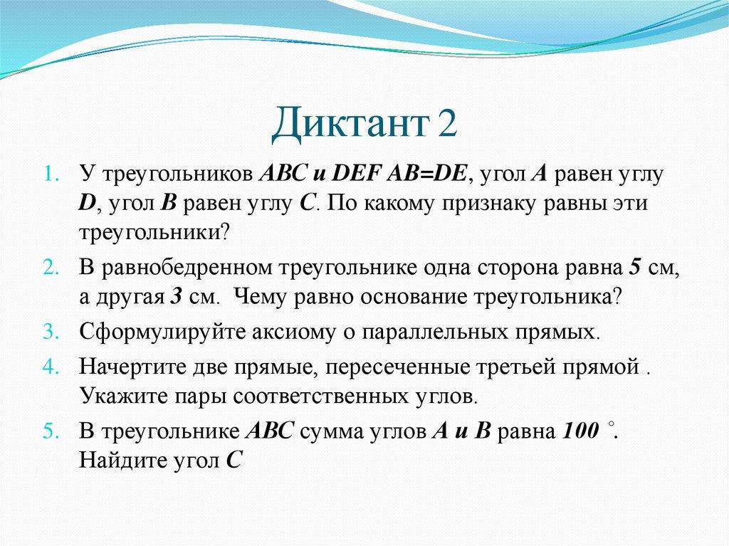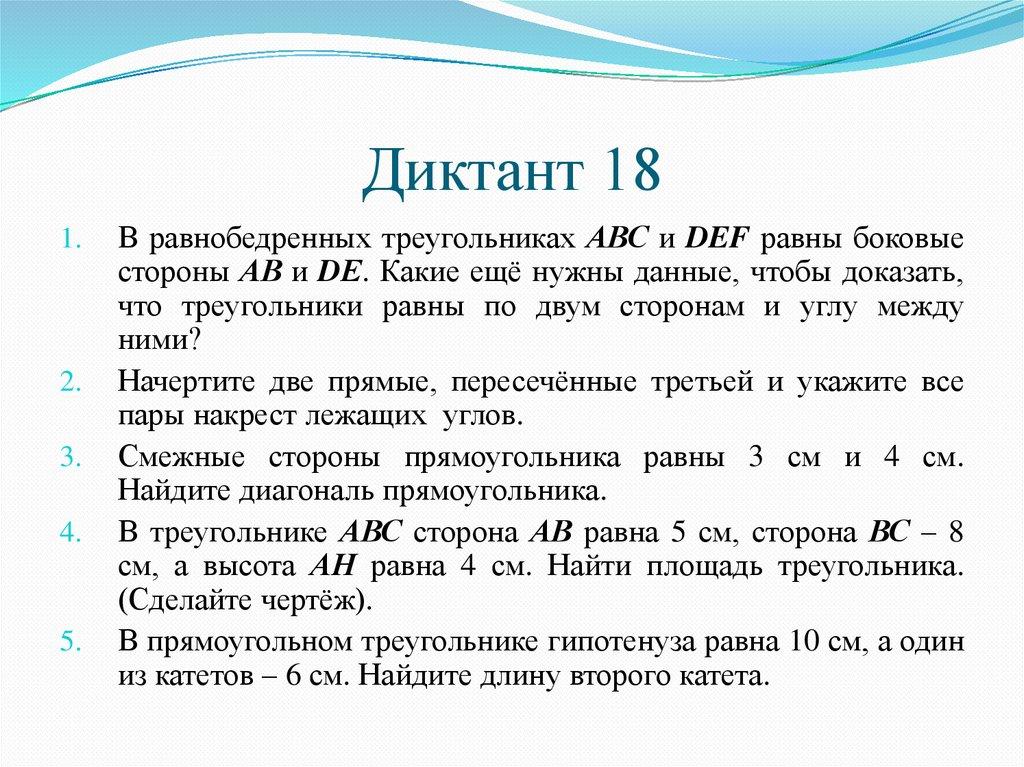 Диктант 21. У треугольников АВС и DEF AB=DE, угол А равен углу