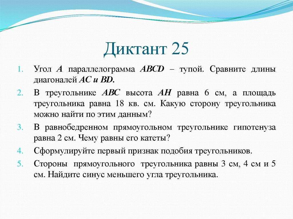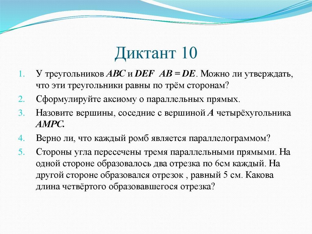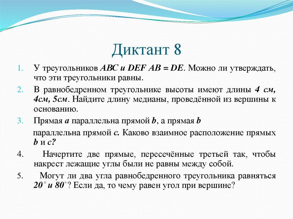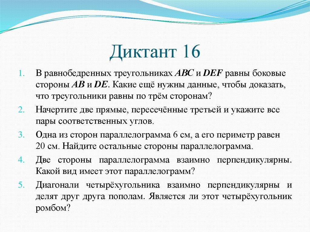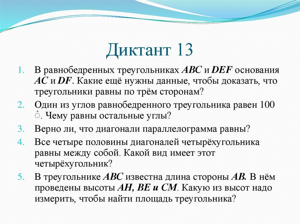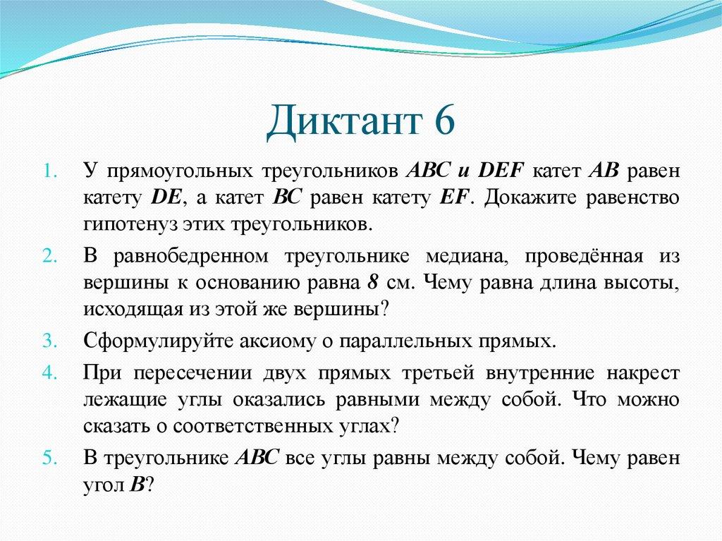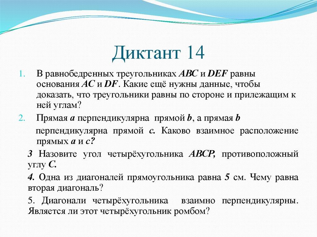 Диктант 21. У треугольников АВС и DEF AB=DE, угол А равен углу