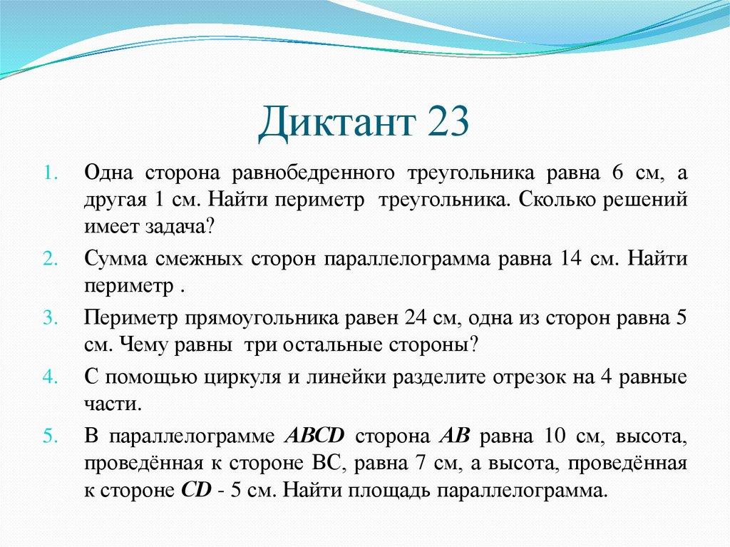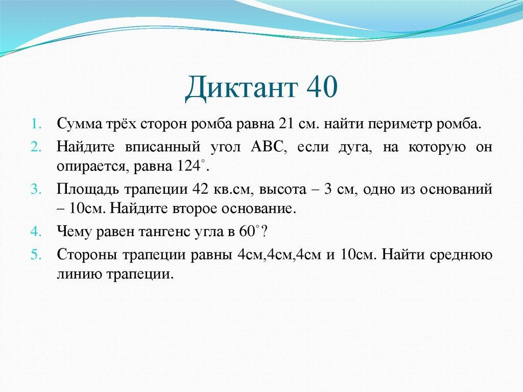 Диктант 401. Сумма трёх сторон ромба равна 21 см. найти периметр ромба.