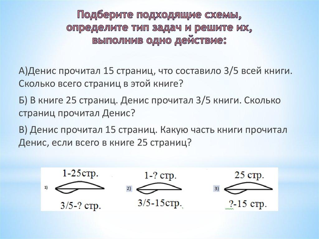 Б) В книге 25 страниц. Денис прочитал 3/5 книги. Сколько