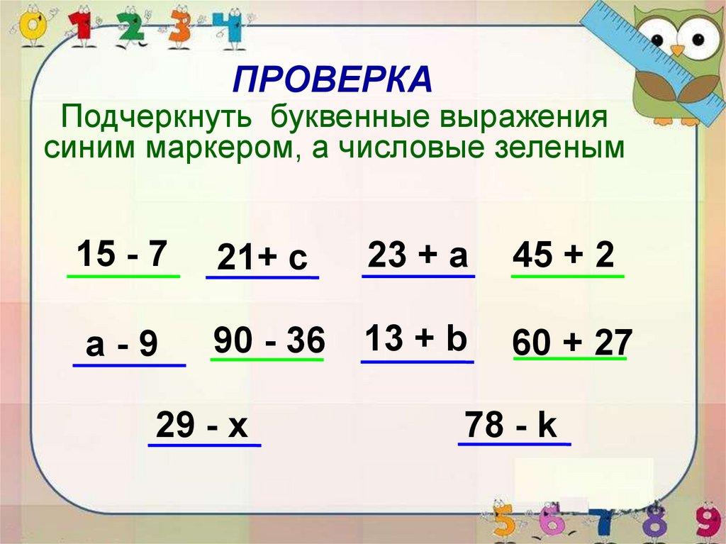 ПРОВЕРКАПодчеркнуть буквенные выражения