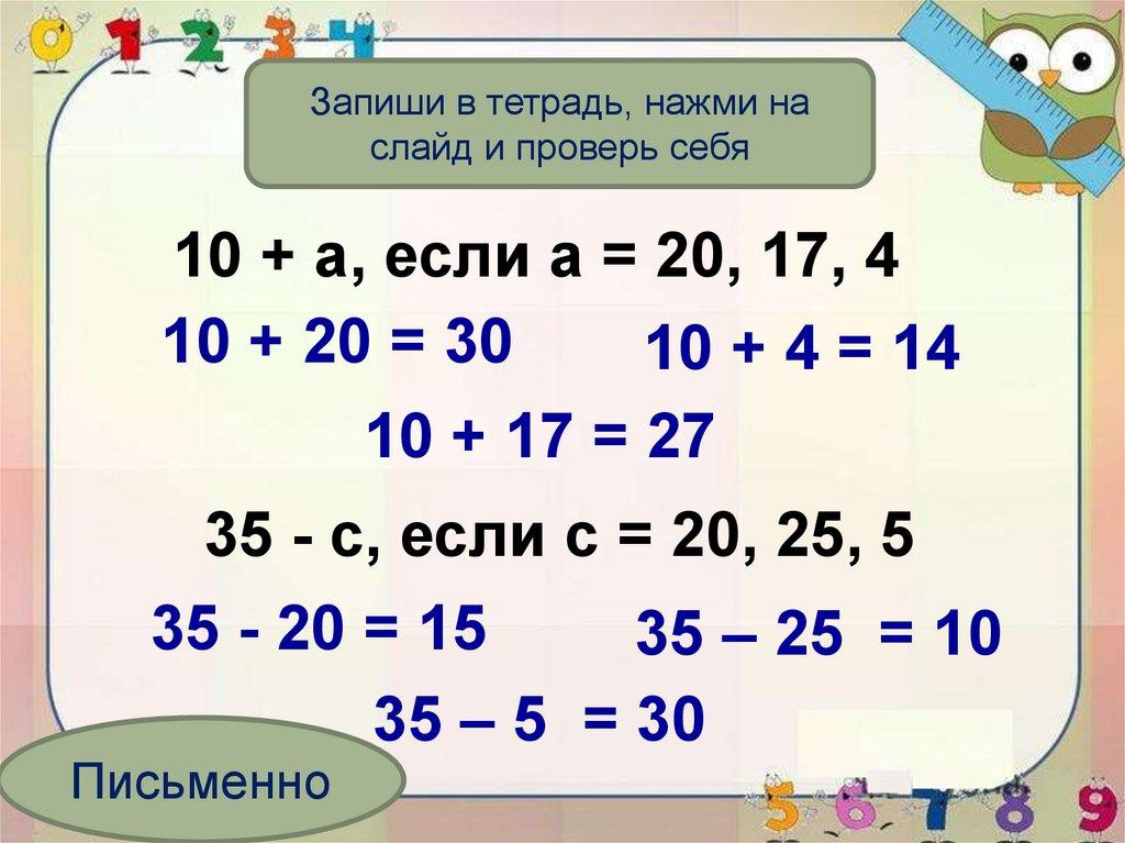 10 + a, если a = 20, 17, 4