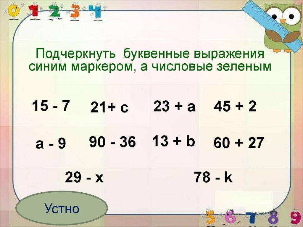 Подчеркнуть буквенные выражениясиним маркером, а числовые зеленым