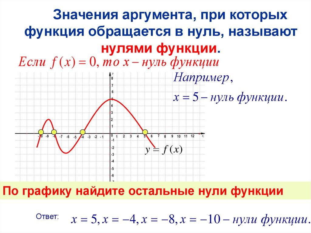Значения аргумента, при которыхфункция обращается в нуль, называют