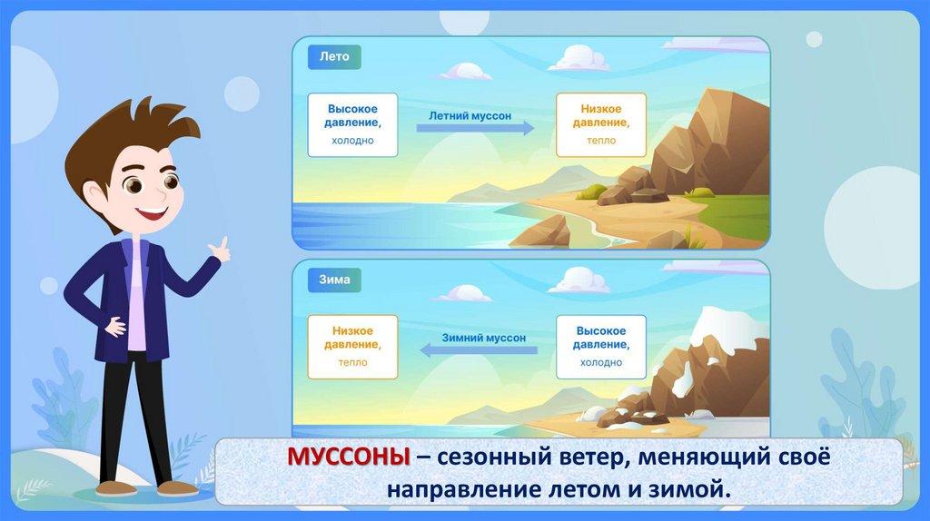МУССОНЫ – сезонный ветер, меняющий своёнаправление летом и зимой.