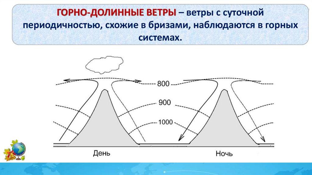 ГОРНО-ДОЛИННЫЕ ВЕТРЫ – ветры с суточнойпериодичностью, схожие в бризами, наблюдаются в горных