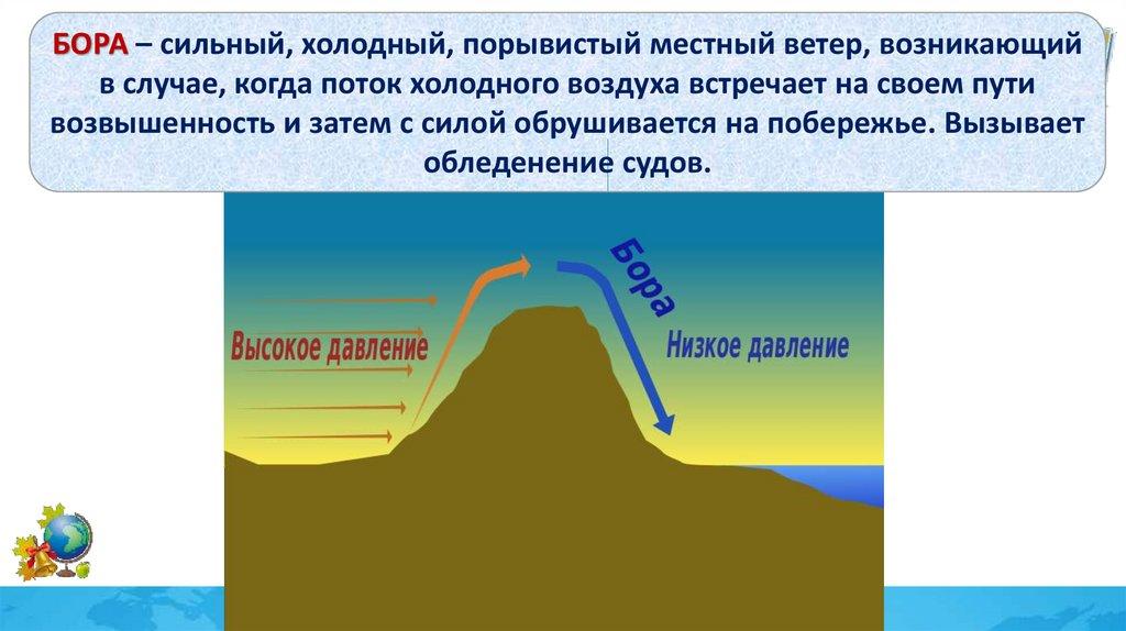 БОРА – сильный, холодный, порывистый местный ветер, возникающийв случае, когда поток холодного воздуха встречает на своем пути
